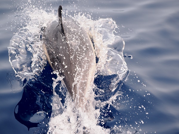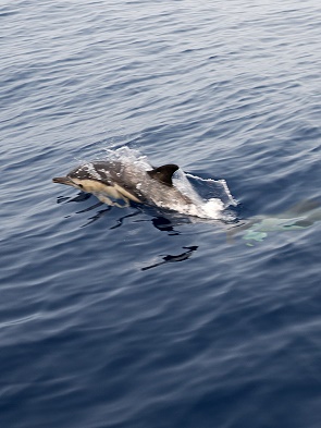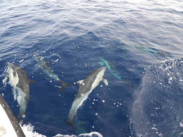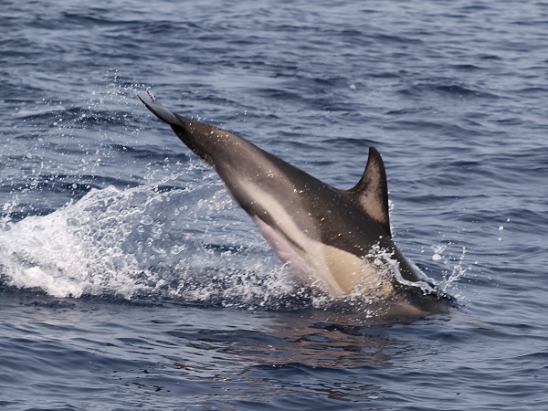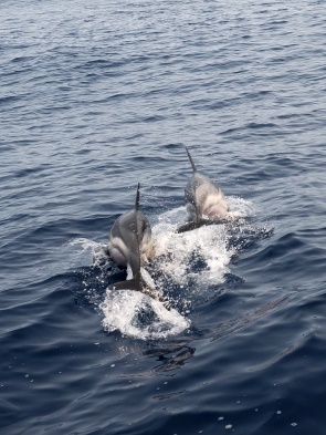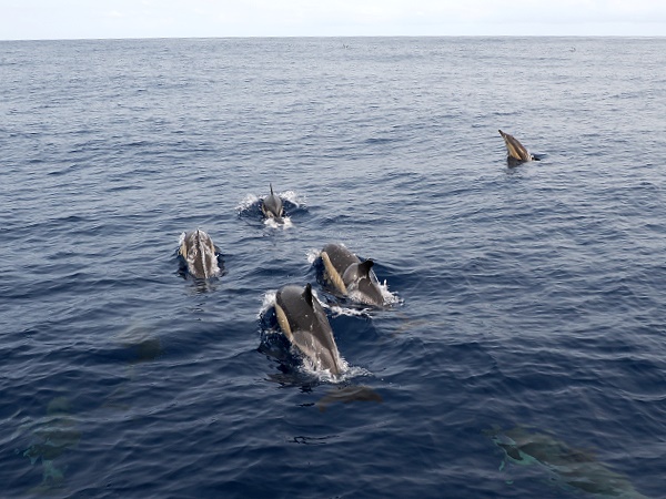 Gemeine Delfine lieben häufige Sprünge, Drehungen und das Reiten auf Bugwellen von Booten. Oft sind sie sehr neugierig und aktiv bei Whale Watching Touren zu sehen, unser Guide war jedenfalls sehr begeistert über ihr Autauchen, weil sie immer viel Spaß zum Sichten und Fotografieren für die Gäste bieten. Auch wir waren begeistert.