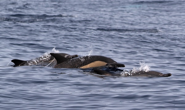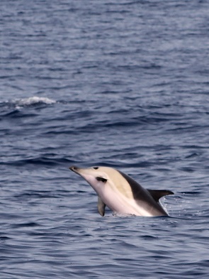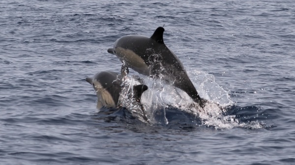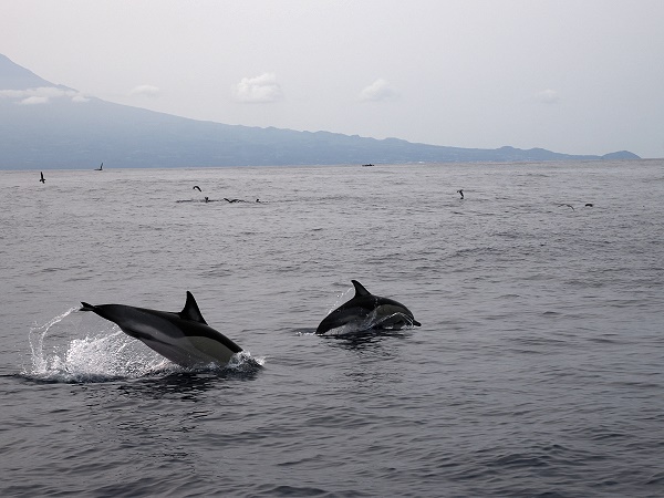 Wie auch bei der ersten Fahrt sahen wir an diesem Tag zwei verschiedene Arten. Waren es vor Pico die Rundkopf-Delfinen (Grampus griseus), auch Risso-Delfine genannt, hatten wir hier eine größere Schule von Gemeinen Delfinen (Delphinus delphis). Sie werden 1,7 bis 2,4 m lang und wiegen 70–150 kg.