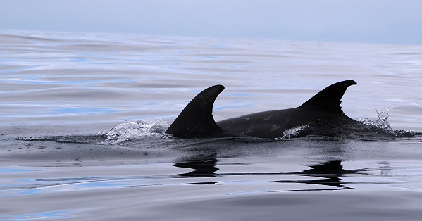 Rundkopfdelfine (Grampus griseus) werden auch "Risso-Delfine" genannt, sie sind erkennbar an den hellen Narben. Eigentlich gehört auch der Gewöhnliche Grindwal (Globicephala melas) zu den Delfinen.