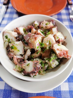 In dem kleinen, einfachen Restaurant mit gemütlichem Innenraum fanden wir noch einen Platz auf der Terrasse. Zuerst haben wir uns einen Oktopus-Salat geteilt, der war sehr lecker. Ich bestellte Thunfisch medium rare, das war auch der einzige Fisch, der hier am Mittag angeboten wurde. Serviert wurde er mit geschälten Kartoffeln, Brokkoli und Zitrone.