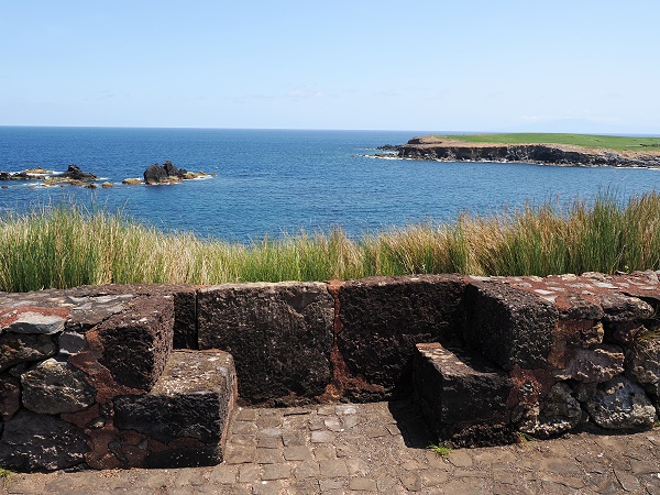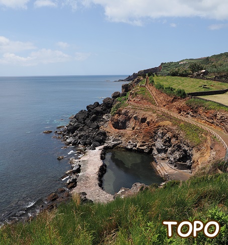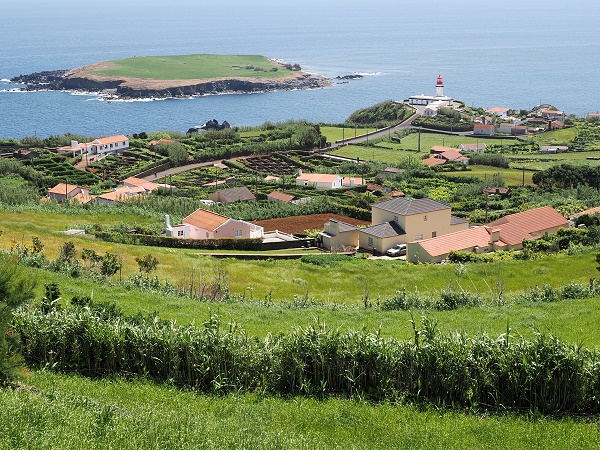 Leider waren wir danach gar nicht mehr im eigentlichen Dorf, im dicht bebauten Zentrum von Topo und haben so die hübsche Parrkirche Igreja de Nossa Senhora do Rosário verpasst. Topo ist auch wegen der 1915 erbauten Heilig-Geist-Kapelle Império do Espírito Santo do Topo bekannt, deren Baustil an die Architektur der Nachbarinsel Terceira erinnert. Bei der Aussicht vom oben erwähnten Miradouro do Topo hatten wir nicht erkannt, dass der Hauptort abseits der Hauptstraße in einem Flußtal liegt, wir hatten nur die Streusiedlung neben dem Leuchtturm und der Badeanstalt als Ziel. Vom Leuchtturm zurück sind es etwa 1,5 km, und dann bis zum kleinen Fischerhafen hinunter nochmal ein Kilometer um die Ecke.
