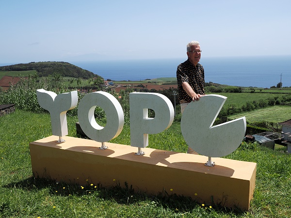 Kurz vor Topo kann man am Miradouro do Topo anhalten, an dem sich auch eine Picknickzone befindet. Und ein großes Schrift-Logo, das als Fotospot sehr beliebt ist. Wir blicken von hier aus über das Dorf Topo, hinüber zu den bewaldeten Hängen und am Horizont auf den weiten Atlantik. Bei guter Sicht reicht der Blick sogar bis zur Insel Terceira.
