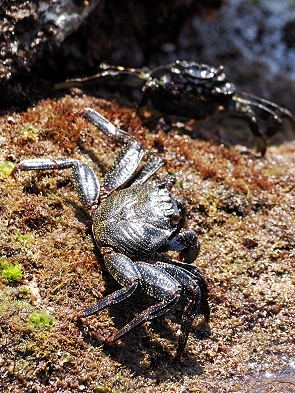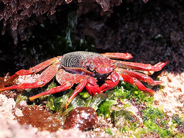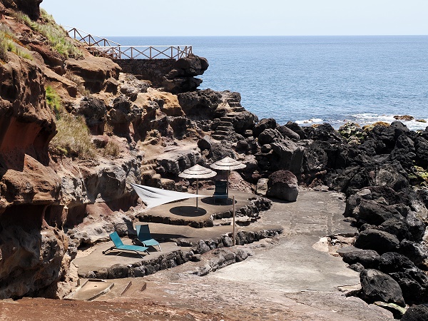 Die Badezone befindet sich an einer kleinen Landzunge aus schwarzer Lava, die wie ein natürlicher Schutzwall ins Meer ragt. Überall sitzen fette Krabben und Rot und Schwarz. Das Becken ist nicht groß, aber durch die vulkanischen Formationen besonders reizvoll – mit Lavabögen, kleinen Unterwasserhöhlen und Felsplattformen, von denen man ins Wasser springen kann.