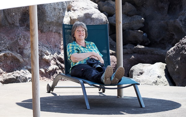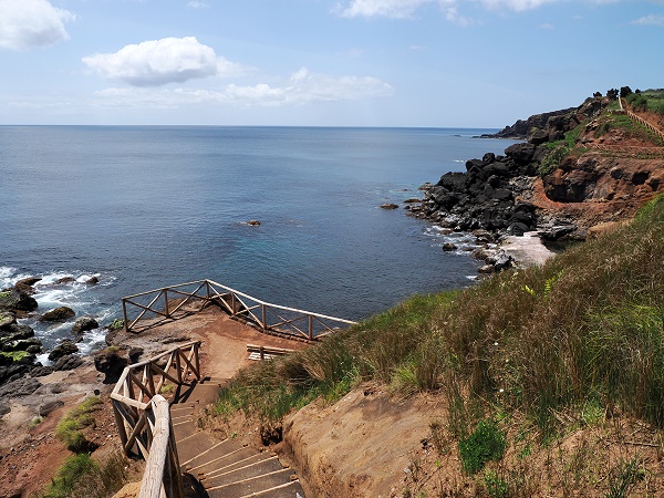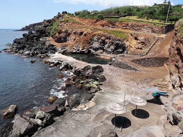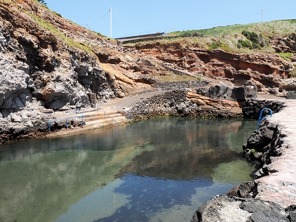 Zuerst sind wir ein bisschen herumgelaufen und haben die Umgebung erkundet. Über steile Treppen geht es hinunter zum schönen Badeplatz. Die Piscina Natural da Pontinha do Topo ist eine der kleinen, fast verborgenen Perlen an der Ostspitze von São Jorge. Sie liegt nur wenige hundert Meter vom Farol da Ponta do Topo entfernt, direkt an der felsigen Küstenlinie unterhalb des Dorfes Topo. Hier war noch nichts los und im Becken schwammen ein paar Fische. Aber es gab sogar einige bequeme Liegestühle und Sonnensegel hier, das findet man selten auf den Azoren.