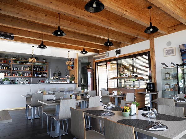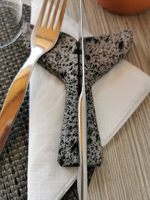 Auf der kleinen Terrasse mit schöner Aussicht war es uns an den noch freien Plätzen zu sonnig, daher haben wir im modern eingerichteten Innenraum am Fenster Platz genommen. Die Tische waren nett eindeckt und Messer und Gabel lagen hier auf Walfluken aus Lavastein, ein nettes Deatail das wir nie woanders gesehen haben.