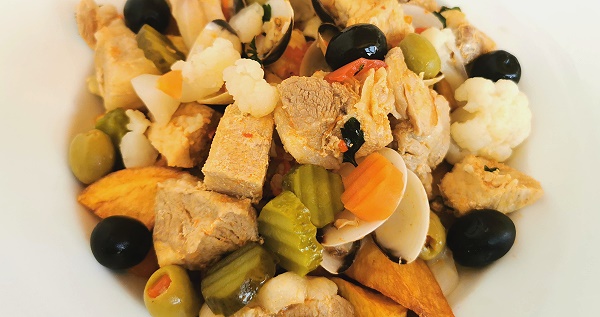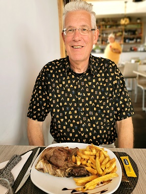 Zum essen hatte sich Michael ein Costeleta de novilho, ein gegrilltes Kalbskotelett bestellt. Dazu gab es Pommes und Senf. Ich hatte ich für Carne de Porco à Alentejana ist eines der bekanntesten traditionellen Gerichte Portugals, ursprünglich aus dem Alentejo, aber heute überall – auch auf den Azoren – beliebt. Mal was anderes, ein deftiger Eintopf aus gewürfeltem Schweinefleisch, Venusmuscheln (Amêijoas) und Kartoffeln. Die Kartoffelwürfel werden dabei separat frittiert und zuletzt untergehoben, alles wird mit frischem Koriander und Zitronenscheiben serviert.