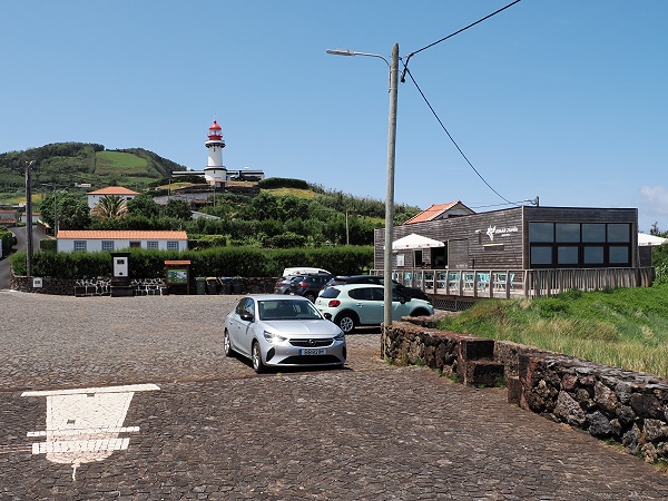 Bis runter an die Küste sind es von hier aus jetzt nur noch ein Kilometer. Man fährt vorbei an dem schönen Leuchtturm und dann steht man auf dem Parkplatz am Ende der Insel São Jorge und etwas oberhalb vom Freibad Piscina Natural da Pontinha do Topo.