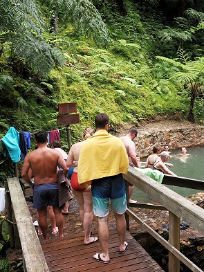 Ehrlich gesagt haben wir schon weltweit schöne Thermalquellen mit nur wenigen Menschen teilen müssen, egal ob in Neuseeland oder Argentinien, so dass wir hier zum Baden gar keine Lust mehr hatten. Man muss ja nicht alles mitmachen, den Thermalpool im Parque Terra Nostra in Furnas fanden wir viel schöner.