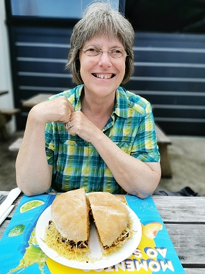 Hier sind wir zuerst zum Essen gefahren, denn wir hatten nach dem Besuch der Ribeira dos Caldeirões Hunger. Da kam uns Elias Snack Bar gerade recht, wir konnten sogar draußen am Tisch in der Sonne sitzen. Der unglaublich nette Besitzer sprach gut Englisch und Michael bestellte sich einen Hamburger, ich hatte mich für Bifana entschieden. Das ist ein traditionelles portugiesisches Sandwich und auf den Azoren sehr beliebt. Es besteht aus dünn geschnittenem, mariniertem Schweinefleisch, das saftig und würzig in einem knusprigen Brötchen serviert wird. Darum lagen noch knuspige Mini-Chips-Sticks.