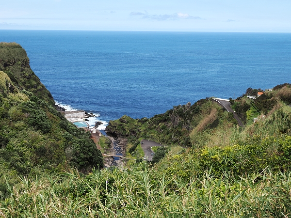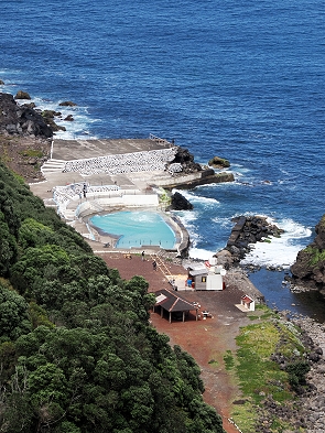 Nachdem wir uns gestärkt hatten, besuchten wir dann das Städtchen. Zuerst liefen wir nach außerhalb zum Aussichtspunkt hoch oberhalb der Küstenlinie. Von hier aus geht es steil bergab zum Naturbadebecken "Boca da Ribeira", auch bekannt als Zona Balnear da Boca da Ribeira. Ende Mai war dort noch nichts los, aber im Sommer ist das schöne Becken an der Steilküste sicher gut besucht.