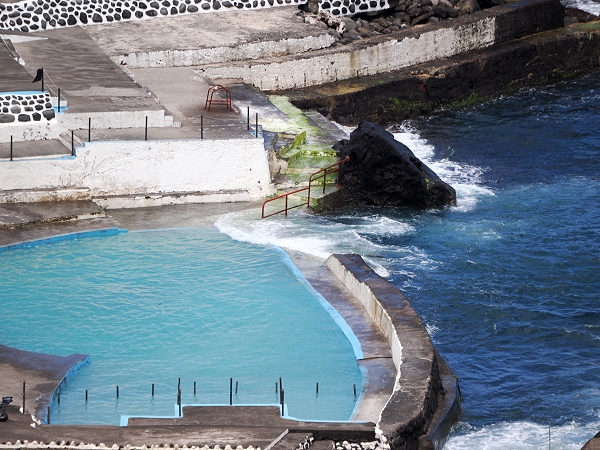 Es befindet sich nahe unterhalb von Klippen und zwischen Lavagestein eingebettet. Typisch das von Flutwellen mir Frischwasser versorgte Becken und die betonierte Liegefläche. Wenn man sich dort erfrischt hat, dann erwartet einen ein kuzer, aber steiler Aufstieg zum Ort, es gibt aber auch einen Parkplatz unten. Wir sind nicht runter gelaufen. Für andere Fußfaule gab es hier am Mirador auch Sitzgelegenheiten auf der Mauer. Bis auf die Schlucht mit dem Badebecken sieht man von der Küste aber wenig.