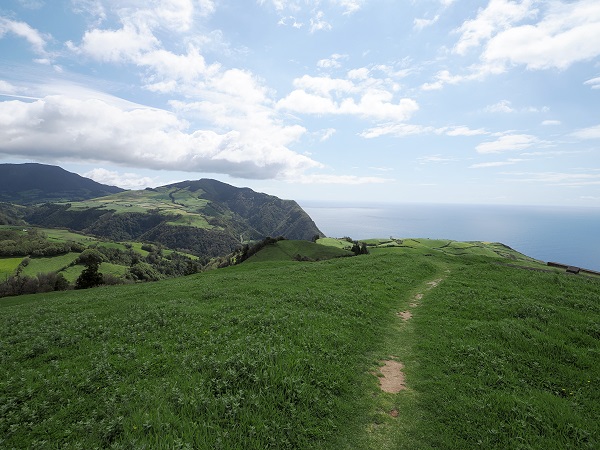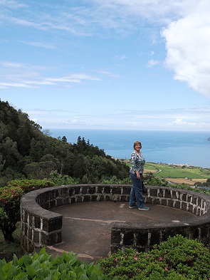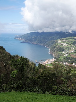 Von diesem Aussichtspunkt aus blickt man über die grünen Hügel rund um Povoação, die umliegenden Weiden mit schwarz-weißen Kühen, zur Ponta do Garajau und man kann in der Ferne das Fischerdorf Ribeira Quente sehen, das wir später besucht haben.
