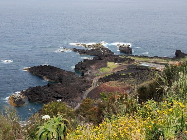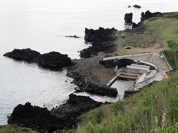 Eine schöne Aussicht hat man auch vom nahen vom Miradouro da Ponta da Ferraria auf Küstenfelsen, Thermalbecken und den Leuchtturm. Schön erkennen kann man von hier oben die Lava-Plattform, hier Fajã genannt. Sie entstand vor etwa 900 Jahren durch vulkanische Lavaströme des Pico das Camarinhas.