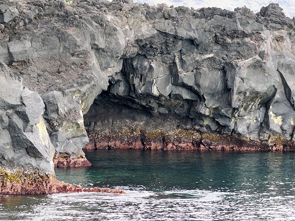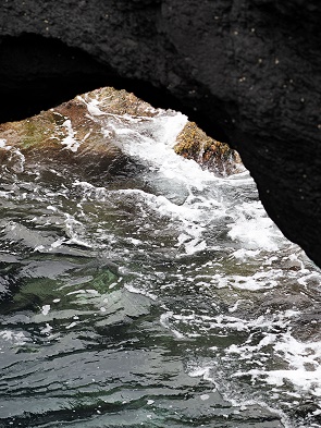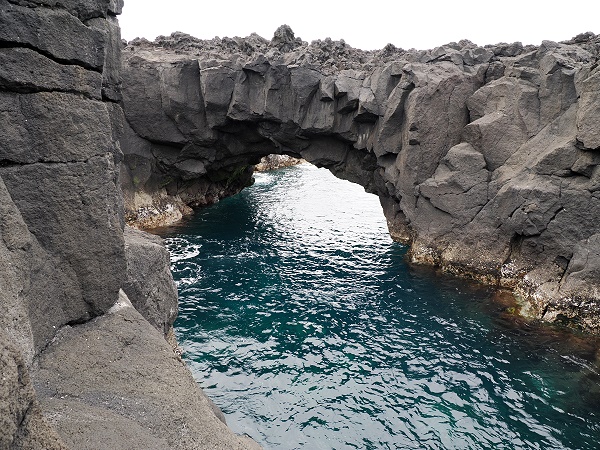 Nach dem Besuch am offenen Badebecken sind wir noch ein wenig an der Küste zwischen den Lavafelsen herumgelaufen, dabei konnten wir einige schöne Basaltbögen entdecken, zwischen denen das türkisgrüne Seewasser hindurchsprudelte. Danach fuhren wir weiter nach Mosteiros.