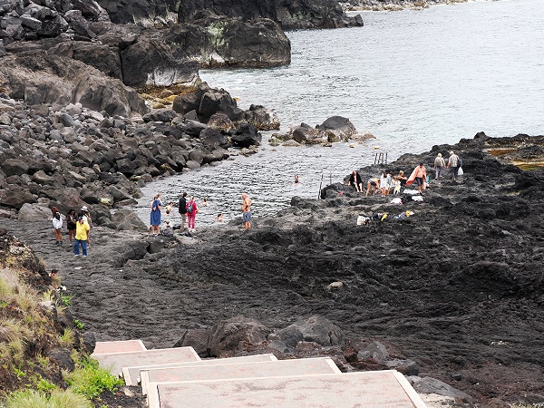 Die beeindruckende Naturschwimmstelle mit Thermalquellen zieht selbstverständlich viele Besucher an, alleine ist man hier wahrscheinlich nie. In den Basaltfelsen befinden sich heiße Quellen, die das Meerwasser auf ca. 30–40 °C erhitzen und nahe der Quelle sogar bis ca. 60 °C. Man sollte trotzdem darauf achten, wann man ankommt, wenn man hier schwimmen will.