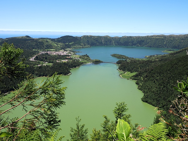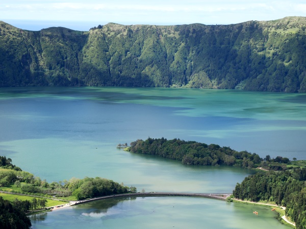 Vom Dorf Sete Cidades am Ufer des blauen Sees ist es nur ein kurzer Weg bis zur steinernen Brücke, die die beiden verschiedenfarbigen Seeteile trennt. Tatsächlich handelt es sich jedoch um einen einzigen See, das Wasser fließt hier unter der Brücke hindurch.