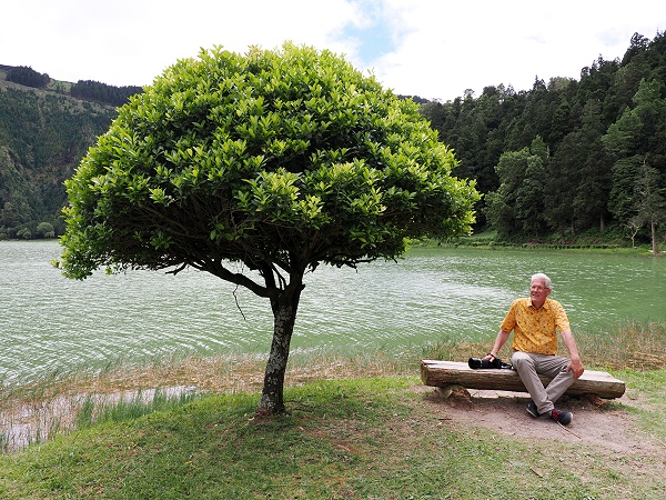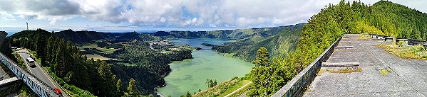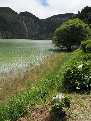 Wir sind hier nur durchgefahren. Der einzige sehenwerte Fotospot außer der Natur, die Allee mit der kleinen Kirche Igreja de São Nicolau liegt von Mosteiros aus kommend am Anfang des Ortes. Die Szenerie kannten wir schon vom Werbevideo unseres Autovermieters, entsprechend voll war es hier. Die Einwohner leben vor allem von Weidewirtschaft, in kleinerem Umfang von Holzwirtschaft und zunehmend vom Tourismus. Unser Ziel war die Straßenbrücke über die Engstelle zwischen Lagoa Azul und Lagoa Verde. Sie verbindet die Ortschaft mit dem Aussichtspunkt Vista do Rei am Südrand der Caldera und weiter mit dem Südwesten der Insel. In der Nähe gibt es Parkmöglichkeiten, und wir entschieden uns für einen Spaziergang am Ufer des Lagoa Azul.
