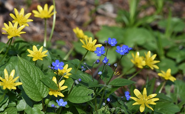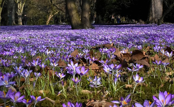 Neben dem hellen Lila der Krokusse bedecken gelbe Winterlinge die Wiesen, es gibt dicke Zierkrokusse in Lia und Gelb, Alpenveilchen und Schneeglöckchen. Auch viele Büsche blühen jetzt, so wie die filigranen Blüten der Hamamelis, die sehr stark duften.