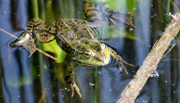 Jetzt im Frühjahr kann man das Treiben im Teich vom Rand aus noch gut beobachten, im Sommer wächst der Uferbereich zu und man kommt nicht mehr so gut ran. Bei Gefahr springen die Frösche in typischer Wasserfroschmanier mit einem weiten Satz ins Wasser, tauchen ab und verbergen sich im Schlamm oder zwischen altem Laub am Boden des Teiches. Allerdings sind die Tiere hier nicht sehr schreckhaft und an Leute gewohnt. Etwas entfernt vom Teich laden Bänke dazu ein, dem Quaken eine Weile zuzuhören.