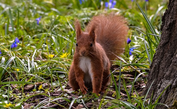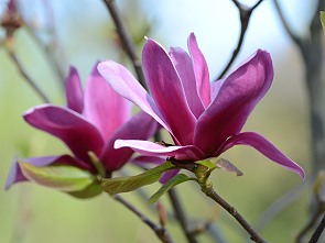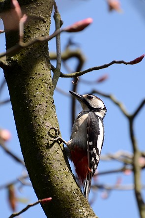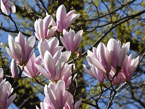 Ein wenig später Ende März blühen dann die Magnolien in ihrer leider nur sehr kurzen Pracht. Schnell liegen die Blätter auf dem Rasen, die dunklen sind etwas später dran. Dazwischen huschen und hüpfen zahlreiche Tiere umher: Amseln, Meisen, Wachholderdrosseln, Eichhörnchen, Tauben, Eichelhäher und so manche Katze aus Nachbars Garten.