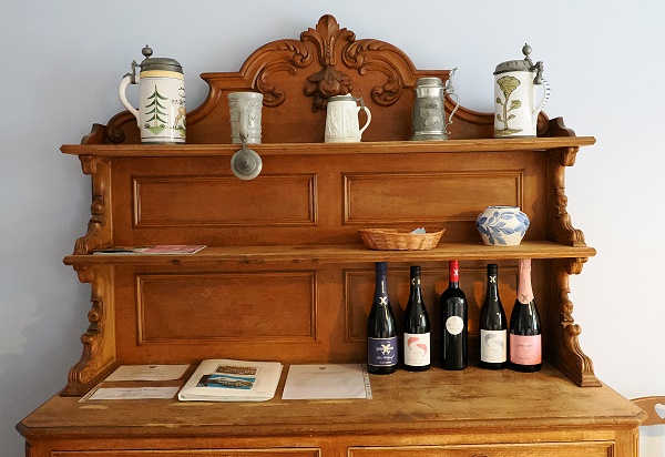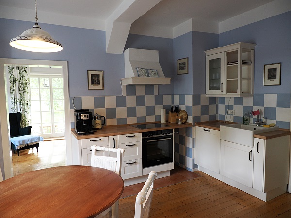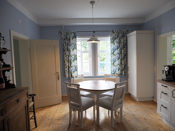 Auch die Ausstattung hat uns bei dieser Wohnung am besten gefallen, vor allem die gemütliche Wohnküche im Landhausstil in Blau-Weiß. Auf dem alten Bauernschrank stehen Weine vom Schwiegersohn aus Wallhausen in Rheinhessen, vom Weingut Prinz Salm. Probiert haben wir sie leider nicht, da wir erst den aus der Saale-Unstrut-Region mitgebrachten Wein austrinken wollten.