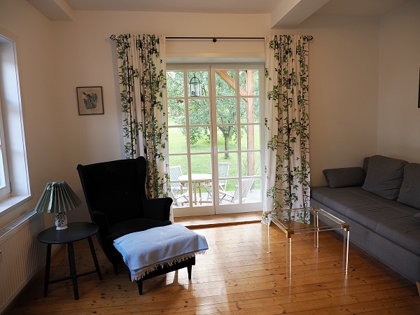 Gegenüber des Eingangs grenzt an die Küche ein helles Wohnzimmer mit großen Fenstern. Hier stehen ein gemütliches Boxspring-Ausziehsofa, ein Ohrensessel mit Fußbank und eine Ablage mit Lampe direkt daneben. Auch ein kleiner Schreibtisch ist vorhanden. Den Fernseher mit Satelliten-TV hatten wir gar nicht an, WLAN gab es natürlich auch. Die Terrassentür bietet direktem Zugang über ein paar Stufen hinunter zum Außenbereich.