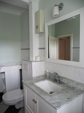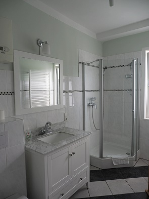 Beim Betreten der Wohnung über den Hausflur steht man gleich in der Küche mit Essplatz. Die Küchenzeile ist mit hochwertigen Markengeräten ausgestattet, es gibt sogar einen einsatzbereiten Kaffeevollautomaten mit Bohnen, einen Toaster, einen Wasserkocher und die komplette Ausstattung mit Geschirr und Kochutensilien. Alles ist schön renoviert. Angrenzend liegt das Badezimmer mit Eckdusche und Toilette. Hier steht auch ein Wickeltisch für Gäste mit Kleinkind.
