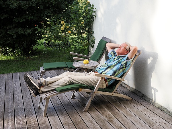 Wir haben uns für die Ferienwohnung namens "Förster Most" im Erdgeschoss entschieden, die war für uns ideal. Denn in der unteren Etage sind Fenster und Decken etwas höher. Hier hat man nicht nur einen Sitzplatz unterhalb des Balkons der oberen Wohnung, sondern auch eine großzügige Holzterrasse in Richtung Westen, ausgestattet mit zwei zusätzlichen bequemen Liegestühlen und passenden Auflagen. Dort konnten wir nach unseren Wanderungen in Ruhe entspannen, mit Blick auf die Obstwiese und die vielen Vögel im Garten beobachten.