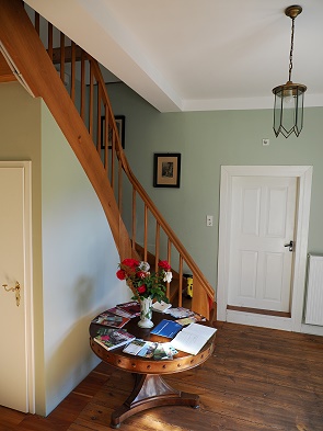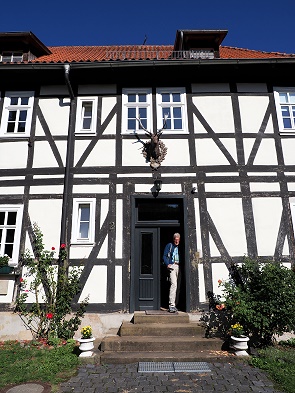 Das geräumige Fachwerkhaus stammt aus dem 17. Jahrhundert und wurde 2020 komplett renoviert. In einem Nebengebäude leben die Verwalter, ein polnisches Paar, das sich um das Anwesen kümmert und die Gäste empfängt. Das Fachwerkhaus verfügt über drei separate, gemütlich eingerichtete und helle Wohnungen und kann auch als Ganzes gemietet werden. Nach hinten hinaus schließt sich ein großes Grundstück mit Obstbäumen, kleinem Garten, einigen Schuppen und Sitzgelegenheiten an. Hier blickt man auf Pferdewiesen, während nach vorne hin andere Wohnhäuser und Scheunen in der Nachbarschaft stehen.