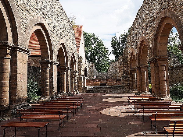 Wen beim Besichtigen Hunger und Durst plagen, für den gibt es das Klostercafé "Refektorium". Im Inneren war es uns zu laut und voll, daher hat der hungrige Michael seine Bockwurst lieber im Innenhof gegessen. Am Eingang gibt es auch einen kleinen Shop, in dem man Klosterhonig, Wein vom hauseigenen Weinberg, Bücher, Schmuck und andere Souvenirs kaufen kann.