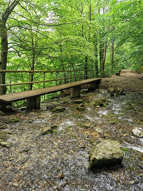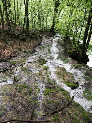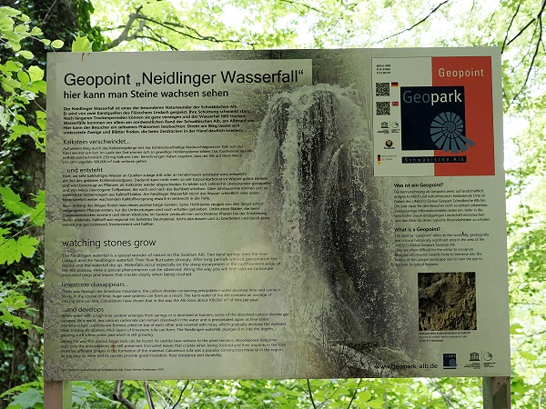 Der Wasserfall ist geologisch interessant, weil er über eine Schichtstufe aus jurassischem Kalkstein fließt, die typisch für den Albtrauf ist. Die Umgebung ist geprägt von Felsen, Karstformationen und kleinen Höhlen. Festes Schuhwerk sei empfohlen, denn nach Regen war der Pfad hier ziemlich rutschig und an einigen Stellen von Waldmaschinen ausgefahren und voller Pfützen.