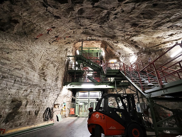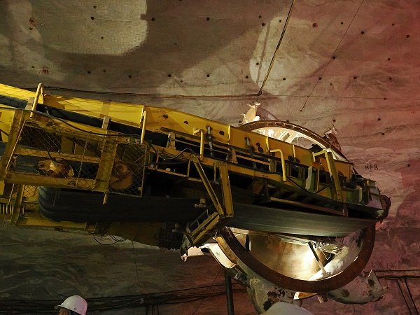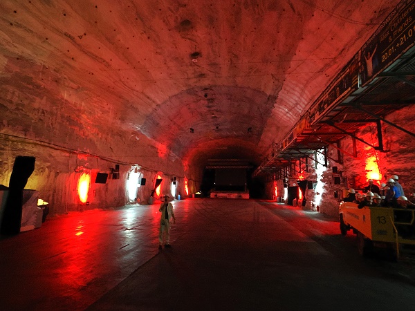 Die Fahrt geht weiter zum ehemaligen Großbunker des Bergwerkes, eine riesige Halle, in der noch heute der größte untertägig eingesetzte Schaufelradbagger der Welt steht. 250 Meter lang, 22 Meter breit und bis zu 17 Meter hoch diente sie bis 1993 zur Speicherung von bis zu 50.000 Tonnen Rohsalz, um die Produktion über Tage auch an den Wochenenden aufrecht zu erhalten. Heute hat der Konzertsaal mit der Akustik eines gotischen Kirchenschiffes.