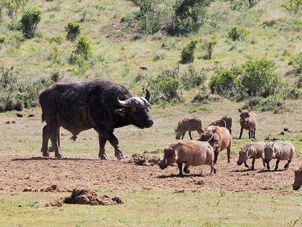 Wir sahen bei den Rundfahrten auch wieder typische Huftierarten wie Bergzebras, Kuhantilopen, Weißschwanzgnus, Kudus und Springböcke. Dazu Mungos, Paradieskraniche, Bokmakiris, Ludwigs-Bustard, Büffel, natürlich Elefanten und dazu jede Menge Warzenschweine in großen Gruppen.