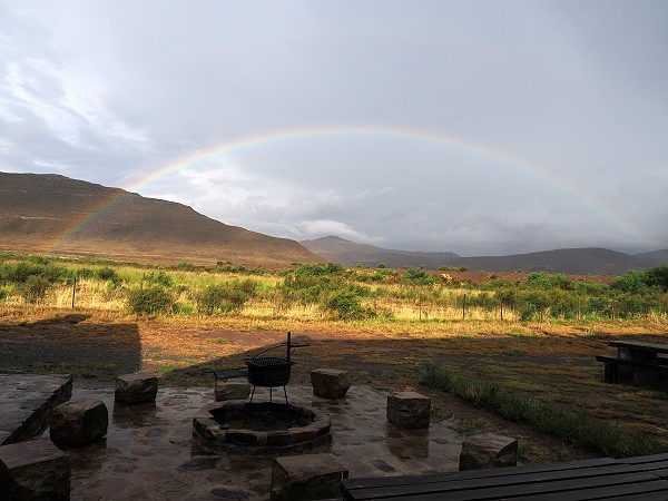Eigentlich hatten wir uns vorgenommen, von hier aus noch einmal eine Rundfahrt über das Sneeuberg Nature Reserve, wo wir im Jahr zuvor im Karoo Cottage gewohnt hatten, zu machen. Dann weiter nach Nieu Bethedsa, das wir ja schon vor vielen Jahren einmal besucht hatten. Leider hatten wir hier nach über drei Wochen direkt am Anfang den ersten Regentag. Dunkle Gewitterwolken näherten sich und dann schüttete es wie aus Kübeln. In den beiden Folggetagen blieb es auf Tweefontein weitgehend trocken, aber in den umliegenden Bergen hingen dicke, dunkle Wolken. Ab und zu sahen wir es am Horizont nocht blitzen. Da hatten wir keinen Bedarf, die lange Strecke über bergige Gravel Roads im Nassen zu bewältigen.