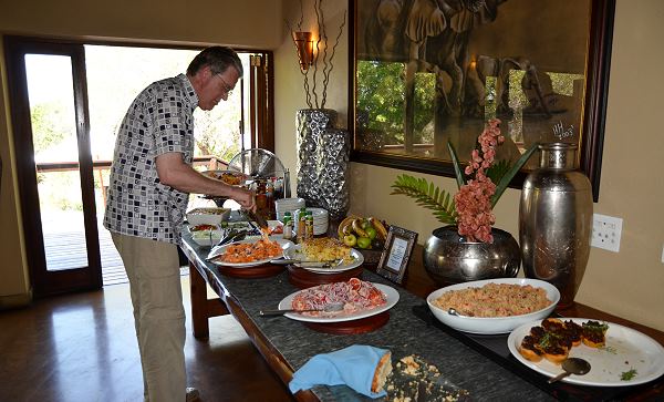 Um 13:00 Uhr folgt das Mittagessen in Buffetform, danach ist bis 16:00 Uhr wieder Entspannung angesagt. Vor der Pirschfahrt gibt es wieder Kaffee, Tee und Kuchen, dann geht es noch einmal für drei Stunden in den Busch. Während der Abendpirsch wird es schon Dunkel und man mit Spots kann man Ausschau nach nachtaktiven Tieren halten. Danach treffen sich alle Gäste in der "Boma" beim Lagerfeuer unter dem afrikanischen Sternhimmel zum Abendessen.