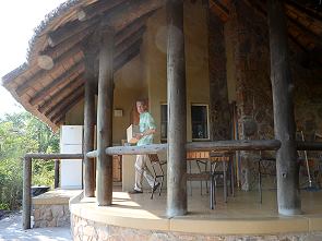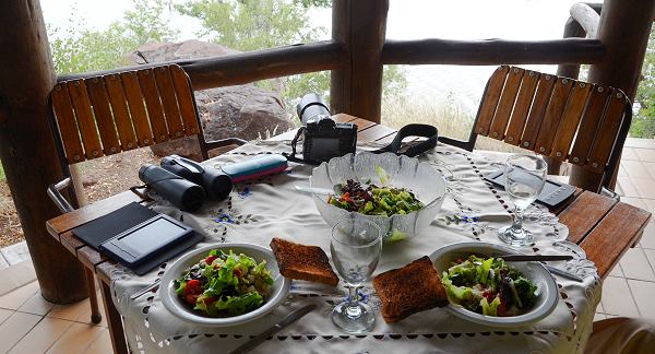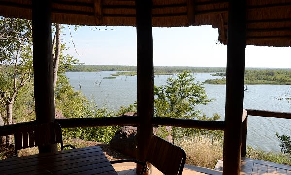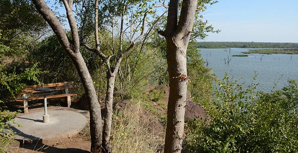 Unter dem Überdach am Badezimmer wohnten ein paar neugierige Borstenhörnchen, die man tagsüber bei ihren Aktivitäten beobachten konnte. Auch ein paar Echsen und zahlreiche Vögel gab es in der Umgebung. Unten im Stausee hörte man die Hippos grunzen. Wer nicht in der Küche kochen möchte, dem steht hier ein eigener Grillplatz mit Parkbank zur Verfügung, der wenige Schritte vom Bungalow entfernt im Busch liegt. Auch von dort hat man einen Blick auf den Pioneer Dam aus einer etwas anderen Perspektive.