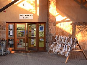 Das Camp hat eine wunderschöne Aussichtsterrasse mit der Aussicht auf den Pioneer Dam, wer keinen Bungalow mit View gebucht hat kann ihn hier genießen. Das Restaurant direkt daneben mit dem gleichen Ausblick ist wie alle im Park ganz akzeptabel und bietet das übliche Angebot wie Pizza, Chips und Burger. Aber viel schöner ist es, wenn man den bereitgestellten Grill auf der eigenen Terrasse anwirft und den Sonnenuntergang am See genießt - gerechterweise muss ich hinzufügen, dass die meisten Häuser rundum vom Busch umgeben sind. Alles, was man für ein klassisches Braai benötigt, bekommt man auch in Mopani im gut ausgestatteten Shop. Eine Tankstelle, eine Lounge namens Ladies Bar und ein Konferenz-Zentrum gehören ebenfalls zum Angebot.