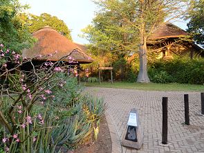 Der gute Eindruck beginnt schon an der Rezeption mit sehr freundlichem Personal. Direkt gegenüber liegt ein schöner Park mit Bänken rund um einen prächtigen Baobab Tree. Hier kann man sich entspannen, kann bis an den Baum heran zu gehen um die Rinde zu befühlen und auf Informationstafeln vieles über die Baobabs der Region zu erfahren.