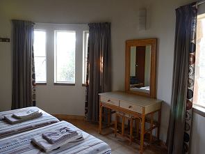 Da Schlafzimmer bietet ein Bett mit zwei Nachttischen und Einbauschränke sowie einen Schreibtisch mit Spiegel. Zweckmäßig, aber in Ordnung für ein paar Nächte. Man hält sich hier ja auch hauptsächlich auf der Terrasse auf. Einmal wegen dem Ausblick, aber auch, weil sich dort draussen die Küche befindet.