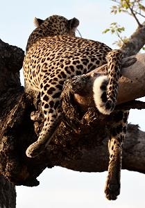 Und im Oktober 2019 klappte es dann auch endlich mal mit einer Sichtung, die uns bisher noch fehlte: Eine Leopardin mit Beute oben im Baum. Und nahe Punda Maria hatten wir dann noch zwei Leoparden im Baum, die am Anfang sehr gut getrant waren. Nur ein paar Autos standen davor und wir konnten die Tiere ganz in Ruhe betrachten.