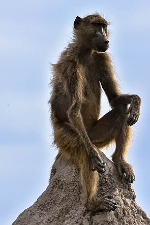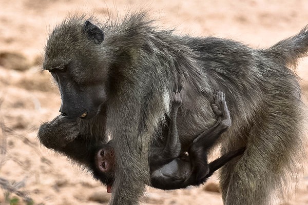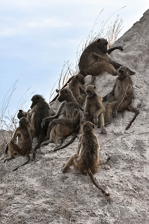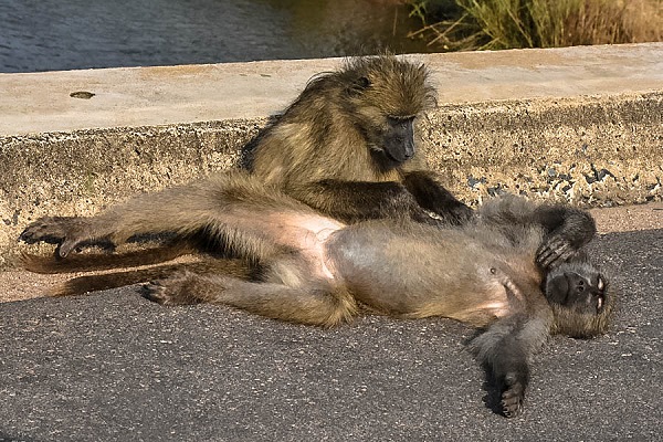 Wie alle Pavianarten leben auch die Bärenpaviane in meist gemischten Gruppen, wo sie ein komplexes Gruppenverhalten zeigen und mittels Körperhaltungen, Gesichtsausdrücken, Lauten und durch Körperkontakte kommunizieren. Bärenpaviane sind Allesfresser; sie haben eine Vorliebe für Früchte, nehmen jedoch auch Blätter, Insekten, Samen und kleinere Wirbeltiere zu sich. In den Camps muss man immer aufpassen, denn sie klauen gerne Lebensmittel aus Kühlschränken oder offenen Autos.