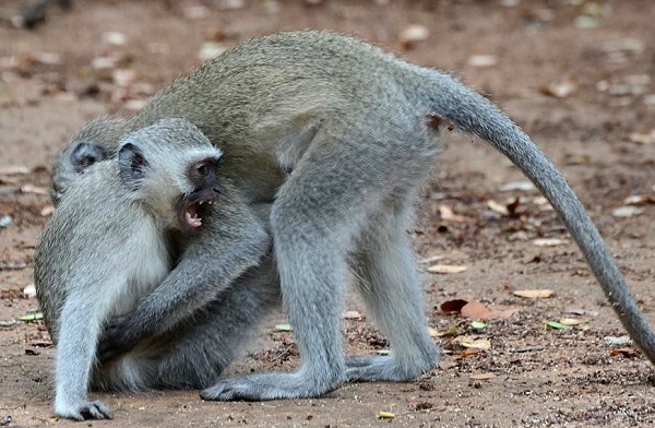 Noch ein bisschen nerviger in den Camps ist die flinke Südliche Grünmeerkatze (Chlorocebus pygerythrus), eine Primatenart aus der Familie der Meerkatzenverwandten. Diese Tiere erreichen eine Kopfrumpflänge von 40 bis 60 Zentimeter, der Schwanz wird bis zu 70 Zentimeter lang. Ihr Gewicht beträgt 4 bis 6 Kilogramm, wobei die Männchen wie so oft deutlich größer und schwerer als die Weibchen sind.