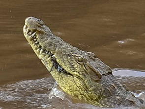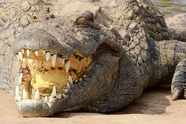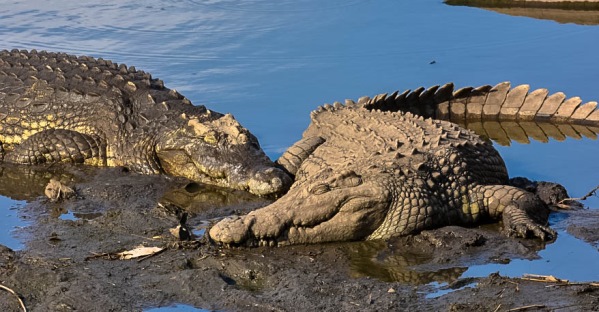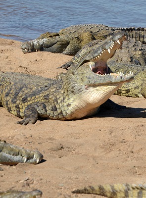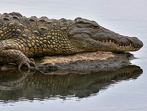Die vierte Gruppe ist die Auffälligste und diese Tiere sind eigentlich am Gewässerrand immer sichtbar, weil sie dort in der Sonne dösen. Es handet sich um die Gruppe der Krokodile. Hier lebt allerdings nur das Nilkrokodil (Crocodylus niloticus) aus der Familie der Echten Krokodile (Crocodylidae).