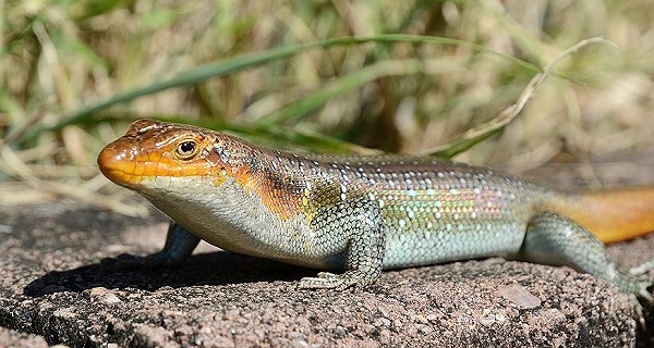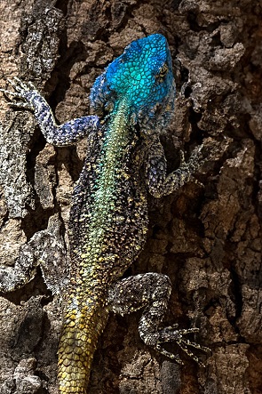 Die hübschen, meist giftgrünen Chamäleons kommen gerne nach Regenfällen raus, dann sieht man sie oft langsam die Strasse überqueren. Mit Abstand die schönste und farbenprächtigste Reptilienart Afrikas ist die Felsagame. Besonders auffällig ist der leuchtend blaue Rücken der Männchen, der zusätzlich einen weißen Rückenstreifen aufweist. Die Weibchen ziert ein grünlich blauer Kopf, während der Körper voller bunter Flecken ist. Beide Geschlechter sind in der Lage, in Gefahrensituationen ihre Körperfärbung zu Tarnzwecken sehr schnell zu verändern.