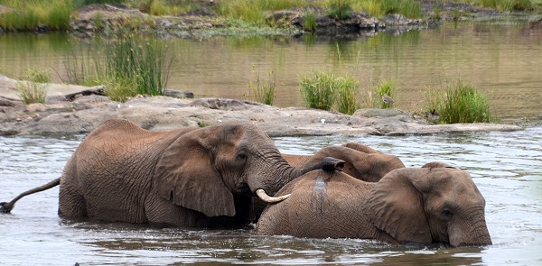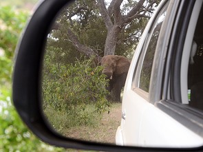 Am Ufer des Shingwedzi beobnachteten wir dann noch einige Elefanten auf der anderen Flusseite, in einer kleinen Sackgasse neben einem Aussichtspunkt stehend. Die männlichen Tiere überquerten dann den Fluss und wir beschlossen weiter zu fahren, bevor sie die Böschung zu uns hinauf erklommen hatten. In diesem Momant knackte es im Buschwerk etwas abseits unseres Standpunktes und ein riesiger Elefant taucht direkt vor uns aus einer Senke auf. Er war zwar noch halb nass von der Flussdurchquerung, hatte aber schon die ganze Zeit ganz nah bei uns im Grün gestanden. Er war viel zu nah um den Motor zu starten und rückwärts zu fahren. So blieben wir mit angehaltenem Atem stehen und bewegten uns so wenig wie möglich, ich traute mich auch nicht ein Foto zu machen, als er direkt neben unserem Auto stand. Dazu ist meine Nikon zu laut, das Bild oben zeigt das letzte Bild, bevor ich zur Salzsäule erstarrte. Nachdem er uns aus kleinen Augen eine Weile interessiert gemustert hatte, ging er gemächlich Vorbei, an den Büschen rupfend. Erst als er ausser Sichtweite war, trauten wir uns weg aus der Sackgasse.