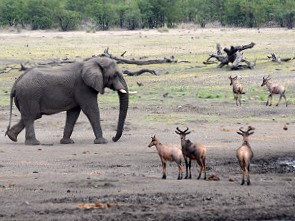 Irgendwann, nachdem wir die spielenden Tsessebe lange beobachtet hatten, näherte sich ein zweites Auto. Dann kamen auch noch einzelne Elefanten vorbei, die aber schnell wieder im Mopanewald verschwanden, nachdem sie getrunken hatten.