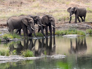 Nachdem wir am Kanniedood Hide am Morgen riesige Elefantenherden mit vielen Jungtieren beobachtete hatten und die Tiere so langsam wieder abgezogen waren, konnten wir unsere Fahrt fortsetzen. Ziel war am Abend das Letaba Main Camp und wir wollten die gleiche Route fahren wie schon ein paar Jahre zuvor: auf der Nhlawu Vlei-Dipene Road in Richtung Grootvlei Dam, dann Richtung Mopani Camp mit einer Pause zum Lunch auf der schönen Terrasse hoch über dem Pioneer Dam und weiter auf der Hauptstrasse in Richtung Süden nach Letaba. Auf dieser Seite beschreibe ich die Strecke bis zum Grootvlei Dam, danach gab es leider auf Grund der extremen Trockenheit nicht mehr so viel zu sehen. Wo im letzten Jahr am Tropic of Capricorn Loop und vor allem am Tihongonyeni Waterhole noch Herden anzutreffen waren, da gab es nur noch vereinzelt ein paar Tiere. Je mehr wir uns Mopani näherten, um so trockener wurde der Mopanewald und es gab in der Ferne sogar Feuer. Im Camp hörten wir, dass die Ranger gerade kontrolliert abbrennen.
