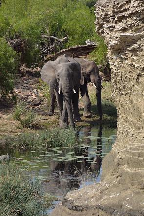 Einer nach dem anderen kam zum Wasser um seinen Durst zu löschen. Es wurden immer mehr, bald war das Ufer voll und sie verteilten sich nach und nach an den Ufern der drei Teiche, die wir von hier oben einsehen konnten. Sehr diszipliniert standen sie nur mit den Vorderbeinen im Wasser, um keinen Schlamm auf zu wirbeln, schließlich kamen immer noch weitere Tiere den Hang hinunter um zu trinken. Nur ein einziger mittelgroßer Elefant konnte es nicht lassen, sich komplett ins Wasser zu setzen und ab zu kühlen. Er wurde aber umgehend von einer großen erwachsenen Kuh mit liebevollen Stößen und intensivem Gerüssel da zu gebracht, wieder aus dem Wasser zu kommen.