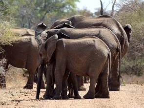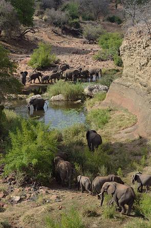 Wir standen dort sehr lange, zusammen mit vier Südafrikanern, und konnten uns gar nicht satt sehen. Die Elefantenherde hat uns sicherlich gewittert und gehört, aber dort unten waren sie sicher. In den Bäumen konnten wir mit dem Fernglas Eisvögel erkennen.