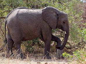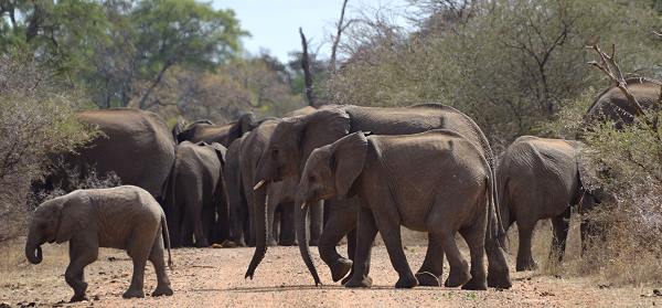 Aber vor allem riesige Elefantenherden haben wir auf diesem Abschnitt gesehen, die immer wieder unseren Weg kreuzen und gefährlich nah heran kamen. Manchmal sieht man die massigen Tiere im Busch erst, wenn es fast zu spät ist. Und dann hält man an, um ein paar Elefanten vorbei zu lassen. Und plötzlich kommt dann die ganze Herde seitwärts und hinter dem Auto aus dem Busch. Dann sollte man warten und sich still verhalten. Die Tiere auf den Fotos unten waren zwar friedlich, aber es waren einige sehr kleine Jungtiere dabei und die alten Tanten wirkten sichtlich nervös.